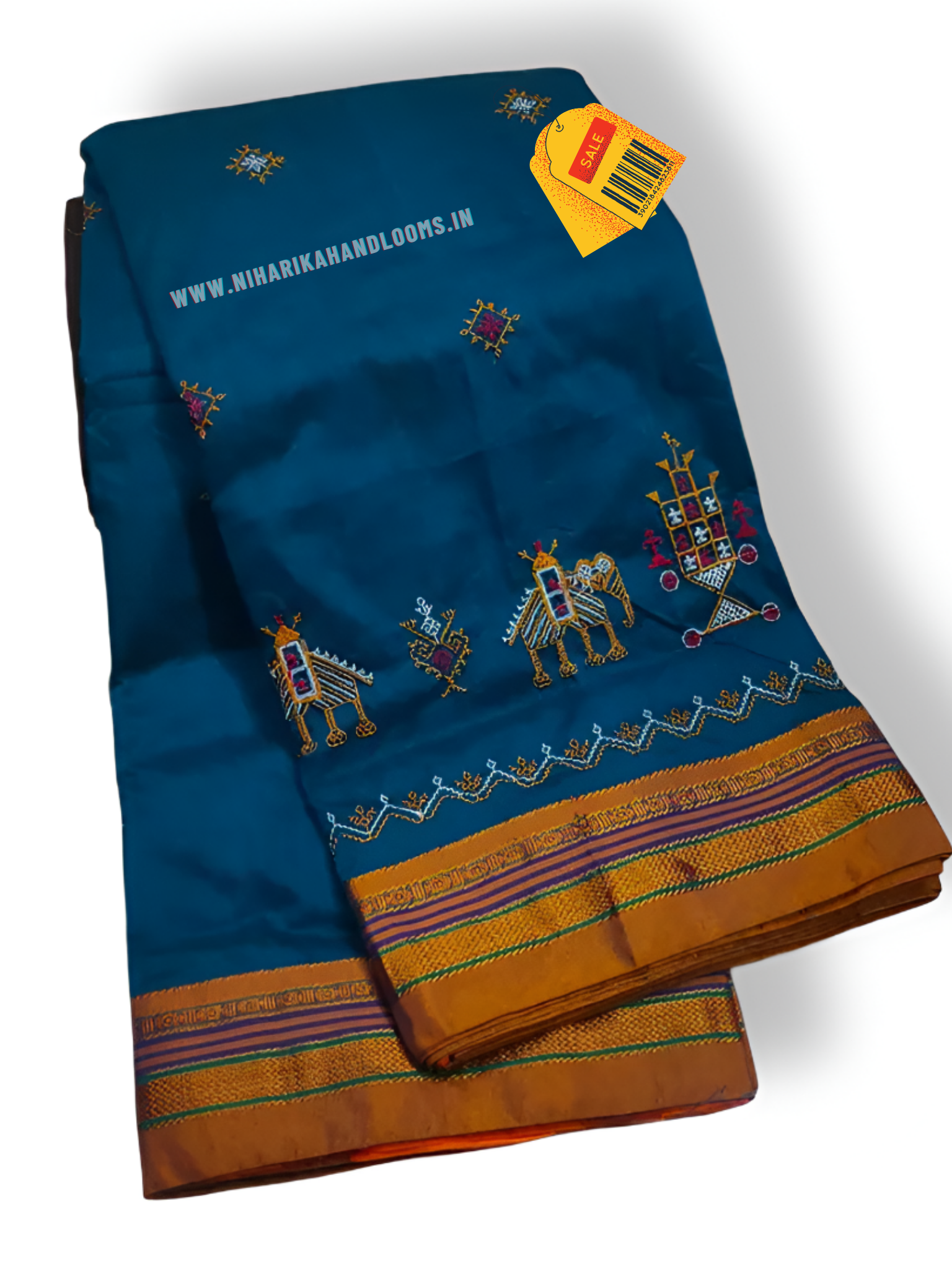Elevate your festive wardrobe with this exquisite handloom silk saree, meticulously crafted to captivate attention. Showcasing vibrant multicolor embroidery featuring traditional motifs, each detail is set against a luxurious deep blue base for timeless elegance. The sophisticated look is further enhanced by a contrasting golden border that adds a touch of regal charm. Designed for special occasions and celebrations, this saree combines comfort, style, and striking craftsmanship. Standard length of 5.5 meters, with an included 0.8-meter matching blouse piece. Ideal for weddings, family gatherings, and festive events.