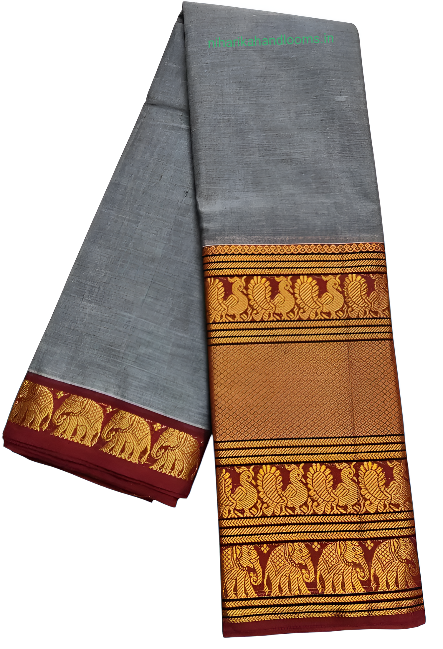 Experience timeless elegance with our Traditional grey golden big border Saree. This exquisite piece is adorned with delicate gold embroidery featuring intricate elephant motifs, complemented by a luxurious gold and maroon border. Perfect for weddings, festivals, and other grand celebrations, this saree promises to make you stand out. Available in a standard sizes, it effortlessly combines tradition with contemporary flair, making it a must-have addition to your ethnic wardrobe.