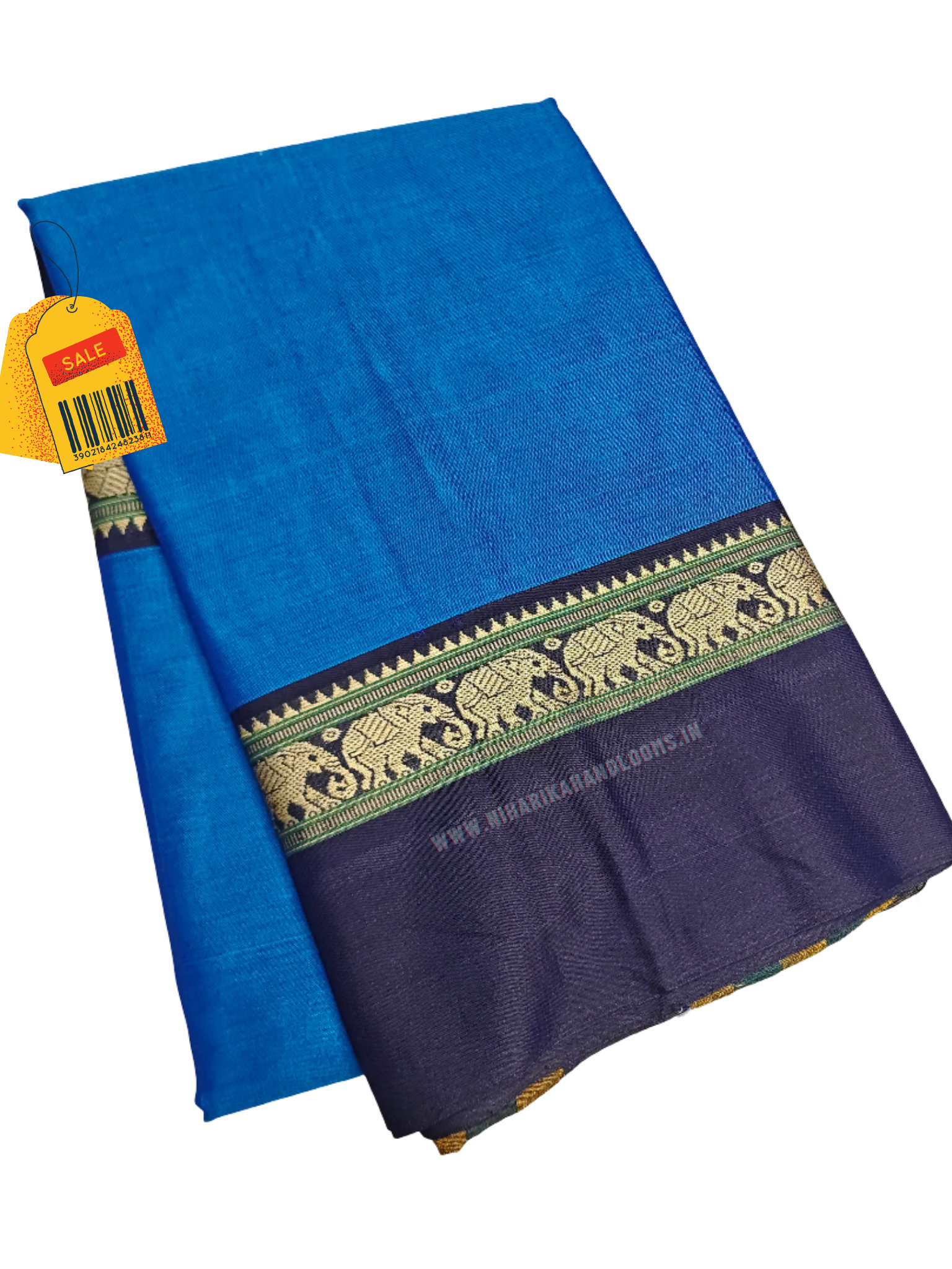Elevate your festive wardrobe with this exquisite traditional blue silk saree, beautifully crafted from premium silk for a luxurious drape and stunning sheen. Featuring a rich golden border intricately detailed with exquisite elephant motifs, this saree thoughtfully blends heritage and elegance. Its vibrant royal blue hue ensures you stand out at any celebration, wedding, or special event. Designed for comfort and grace, the saree measures 6.3 meters in length, ideal for versatile draping styles, and comes with an unstitched matching blouse piece. Make a timeless statement with this elegant silk saree, perfect for those who appreciate artistry and tradition.
